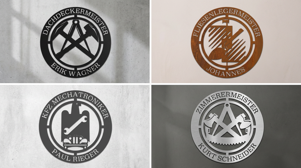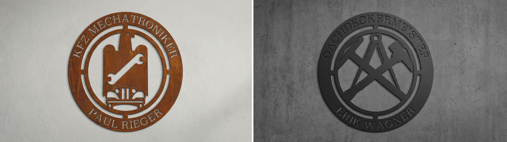 Unsere Schilder werden aus 2mm dickem Stahl gefertigt, mittels Laser geschnitten und in verschiedenen Farben pulverbeschichtet. Wir haben eine Auswahl klassischer Farben wie Schwarz, Anthrazit, Weiß und Gold. Außerdem bieten wir Edelstahl und Cortenstahl an, die für ihre einzigartige Rostoptik bekannt sind. Für spezielle Farbwünsche stehen wir Dir gerne zur Verfügung.